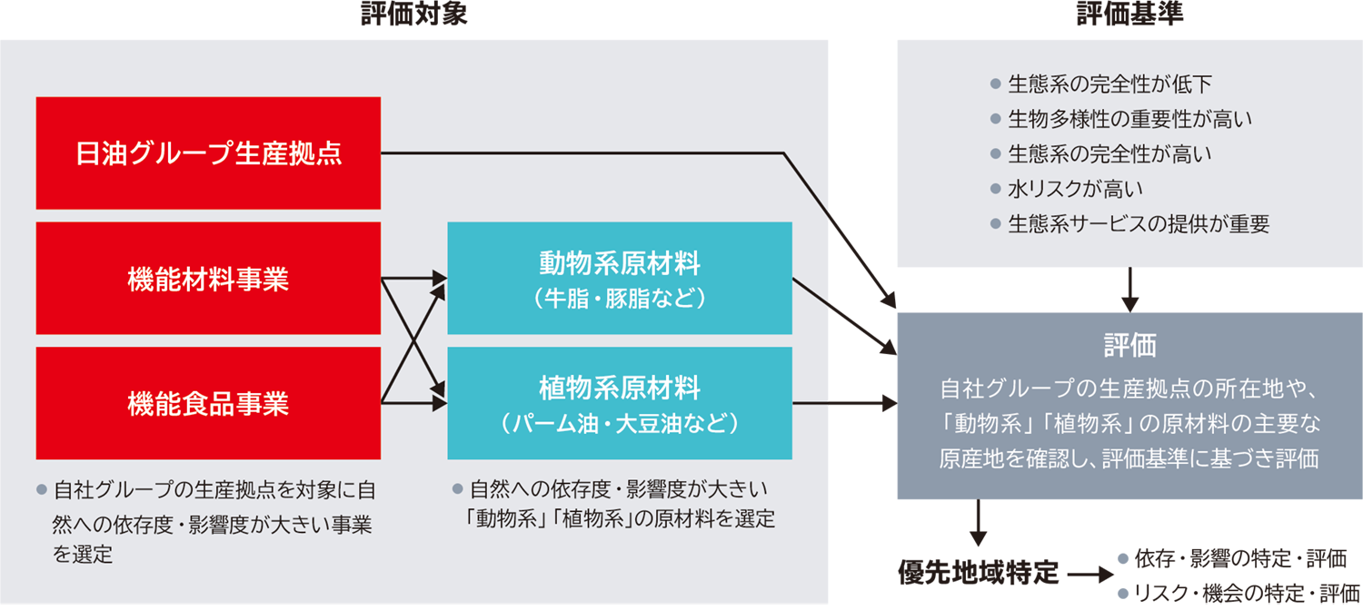 日油グループは自然資本との関連を分析する対象範囲を、「日油グループのすべての生産拠点」および、バリューチェーン上流における分析においては、事業規模と自然への依存度・影響度の大きさを踏まえ、機能材料事業と機能食品事業が使用する動植物由来原料産地を分析対象としました。