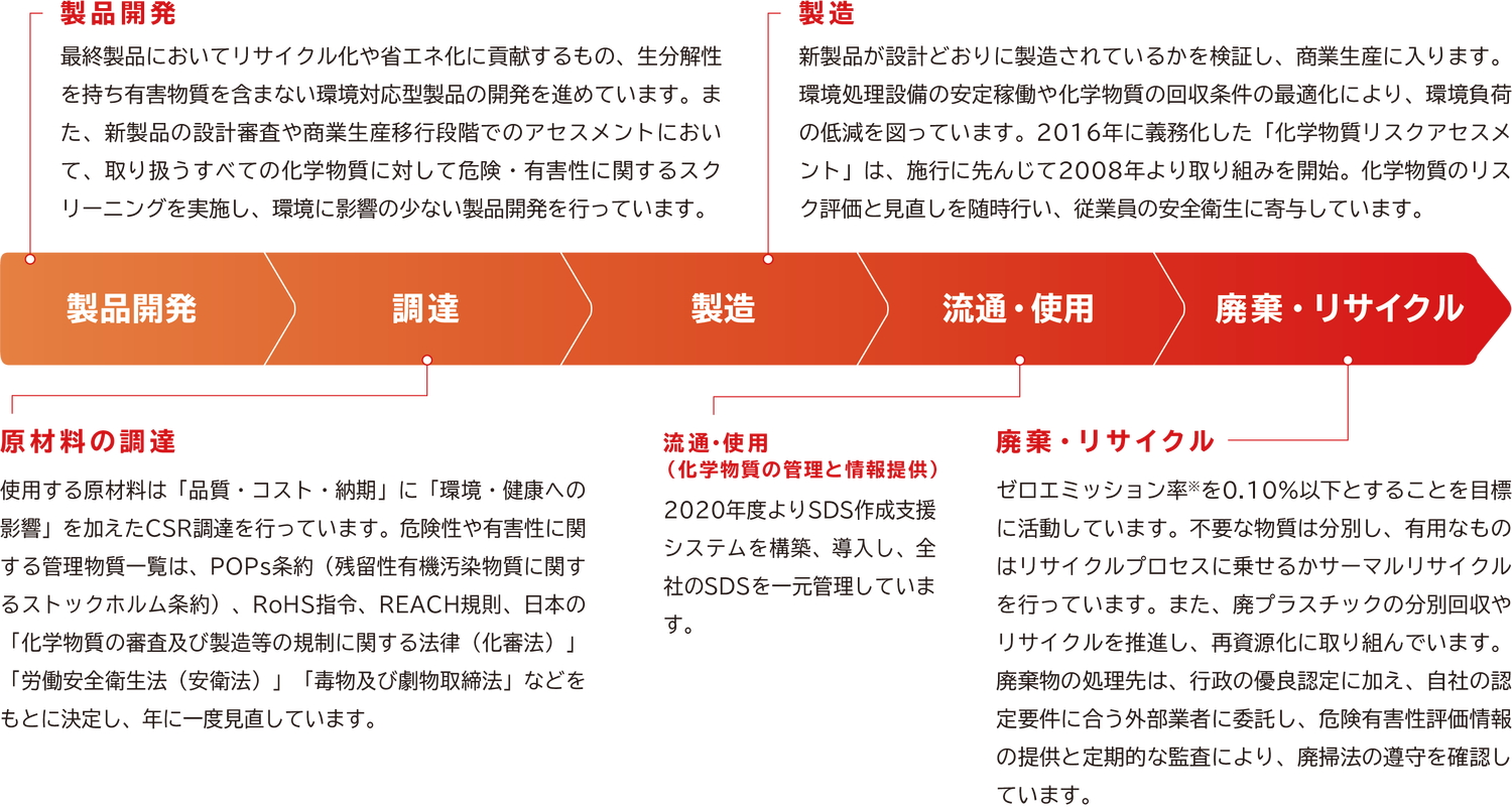 化学物質リスクアセスメントを徹底し、製品開発段階から環境負荷や危険有害性の情報を収集・整備しています。これにより、危険有害性の分類・格付けを行い、法規制の適用事項を明確化し、製造・取扱・貯蔵・流通・廃棄に至る全プロセスで安全性を確保しています。 - 潜在危険の確認と対策の実施