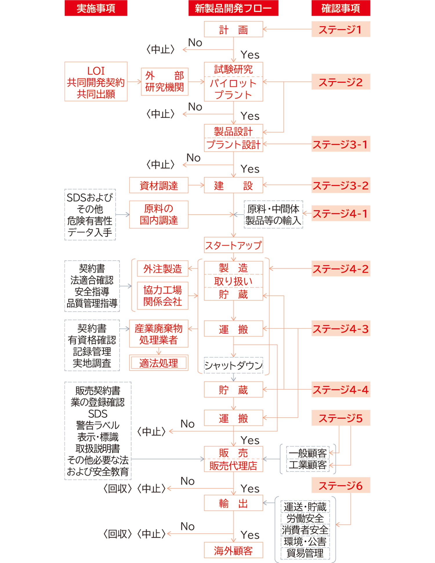2 | ①市場性・商品性 (機能性,安全性,容器・梱包,輸送方法,産業廃棄物対策,製造・販売コスト,販売価格,省エネルギー等)の詳細確認, ②製造工程および分析検査方法確立,③GLP,GMPの必要性調査,④特性値・反応および爆発危険性の調査, ⑤安全性試験費用等のチェック,⑥新規化学物質申請(化審法,安衛法), ⑦CAS,TSCA,HCS,CEPA,WHMIS,EINECS,REACH規則,FD&CAct等の調査, ⑧SDS,警告ラベル,表示・標識,取扱説明書,各種毒性情報の確認,⑨セールスマニュアル,⑩契約内容,⑪特許・商標出願, ⑫文書記録の保存 |