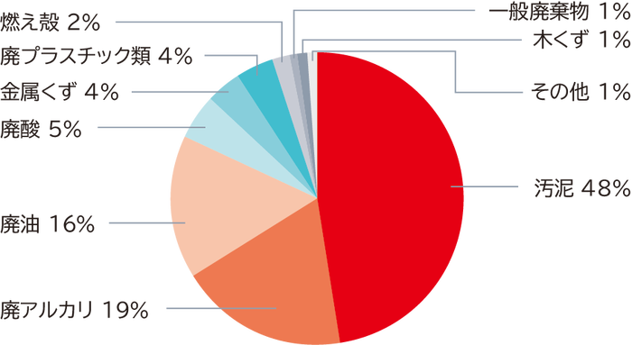 2024年度の日油グループの廃棄物発生量は、148,643トンとなり、このうち、社内での減量策により83.1%を削減し、16.3%を外部処理委託しています。外部処理委託量の内訳は、外部リサイクル量が10.5%、外部減量が5.2%、埋立処分量が0.7%となり、廃棄物発生量に対するリサイクル率は、11.0%となりました。