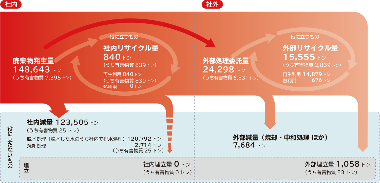 分類 | 工場排出廃棄物量 | リサイクル量 | 外部処理量 | 最終埋立処分量 |