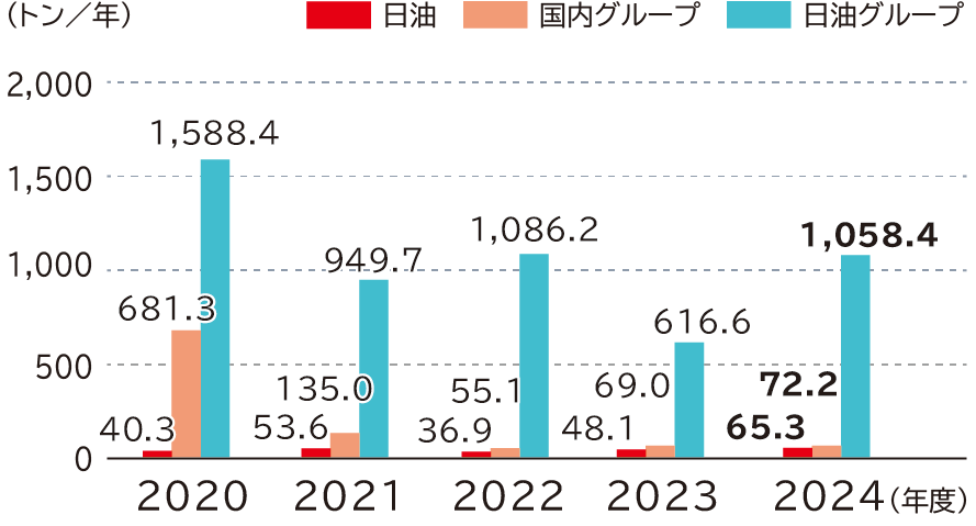 2024年度の国内グループの最終埋立処分量は72.2トンで、ゼロエミッション率は0.047%でした。一方、日油の最終埋立処分量は65.3トンで、ゼロエミッション率は0.043%でした。
