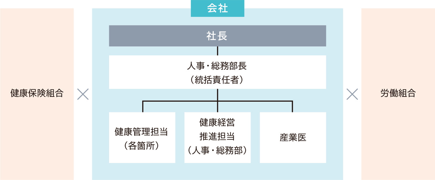 人事・総務部長を統括責任者とし、人事・総務部の健康経営推進担当を中心に、重点項目に掲げた取り組みを推進していきます。また、推進にあたっては、「各箇所における健康管理担当」・「産業医」・「健康保険組合」・「労働組合」等と連携していきます。
