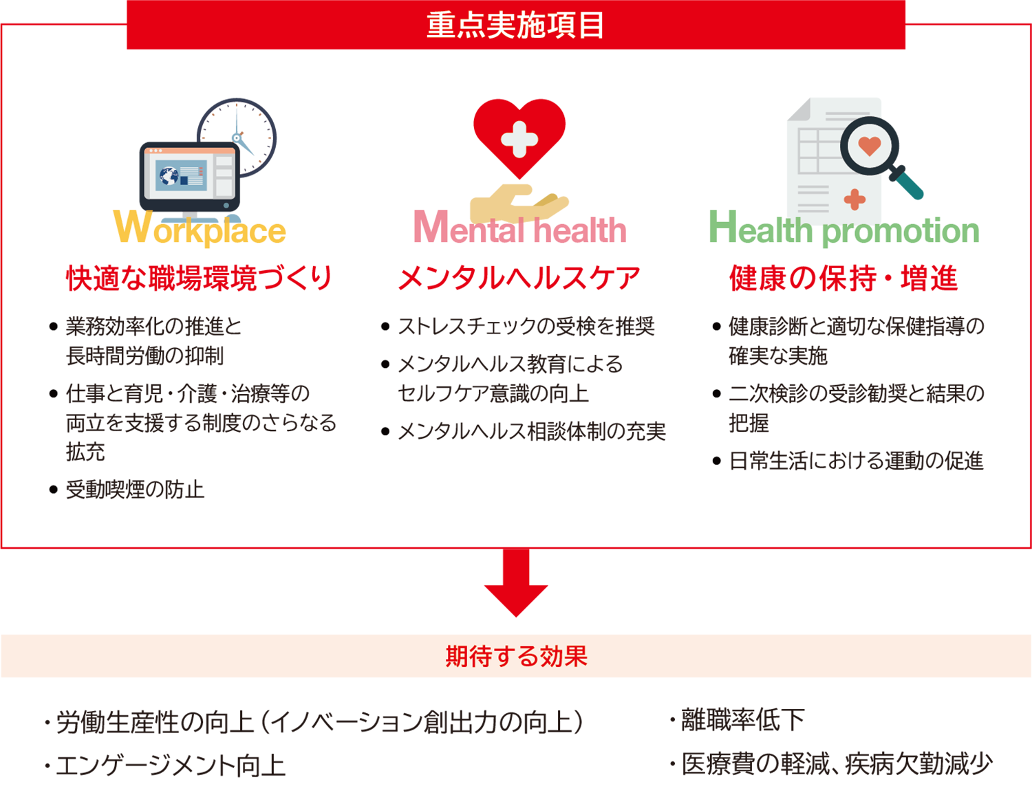 また、PDCAサイクルを回しつつ健康保険組合や産業医と連携を進め、従業員の意識向上と企業価値向上を進めていきます。