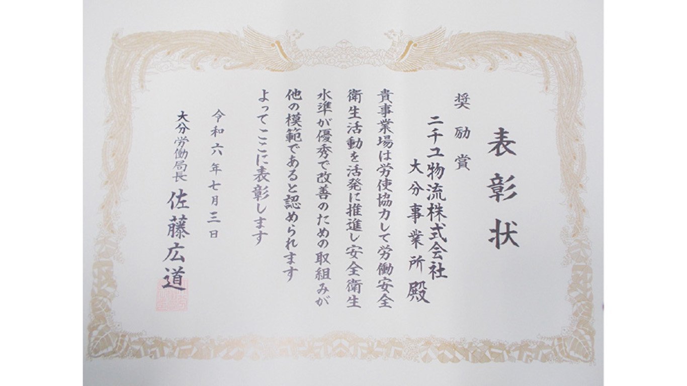 ニチユ物流㈱ | 2024/7/3 | 大分労働局 安全衛生優良事業場等表彰奨励賞受賞 |
