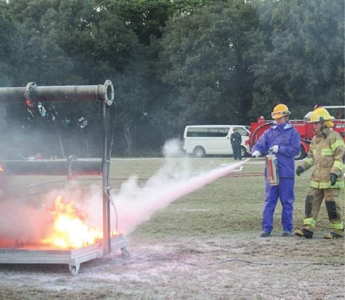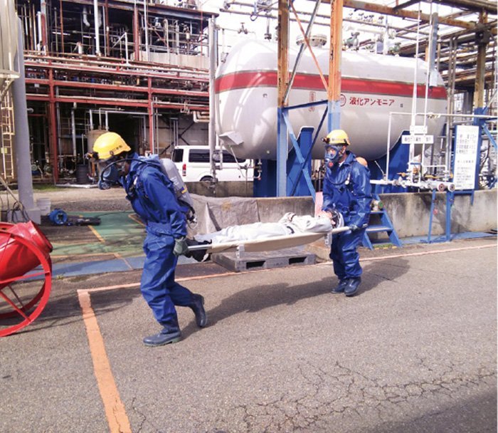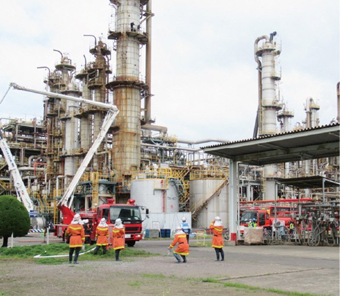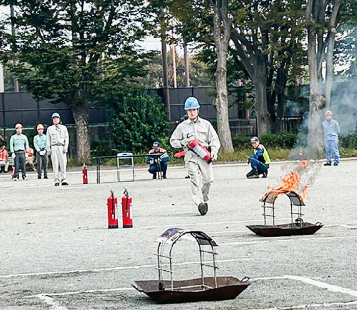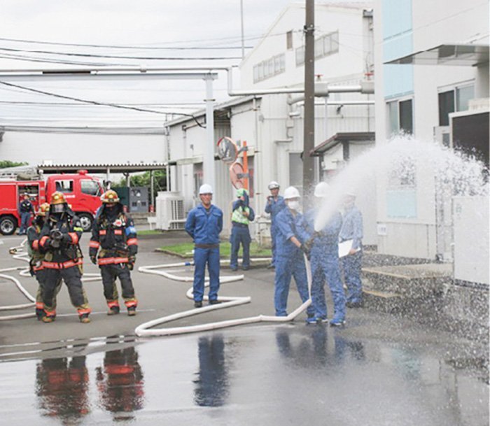 日油グループでは、有機過酸化物をはじめとする危険物、火薬類を製造し、災害発生時に社内外への被害を最小限にとどめることを最重要事項と考え、積極的に防災訓練に取り組んでいます。特に地域組織との合同防災訓練を定期的に実施することで、地域と一丸になった災害対策の強化を図っています。また、地元自衛消防隊消火操法大会などにも積極的に参加することで、消火技術の向上を図り、地域へ安全意識の高さをアピールしています。
