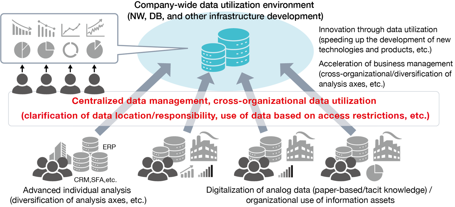 To realize innovation and improved productivity through data utilization, we will develop the data utilization environment. In addition to infrastructure development, we are also looking into the development of a data management system, including rules and organization. We will establish an environment and structure to optimize manufacturing processes, improve defect rates, optimize inventories, automate production planning, conserve energy, streamline R&D operations, promote the use of intellectual property, strengthen preventive maintenance, promote occupational health and safety, visualize skills, and pass on know-how.